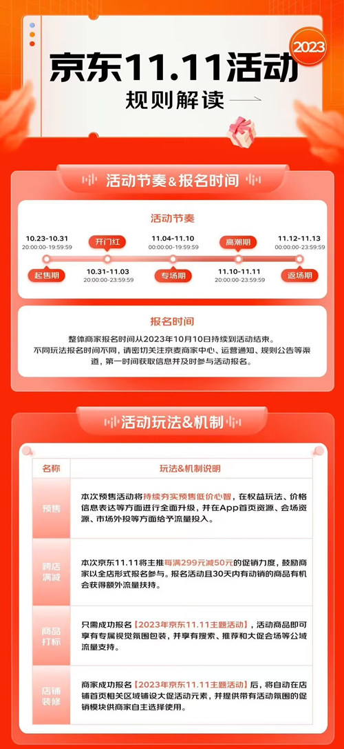 京东 2023 年“双 11”分为起售期、开门红、专场期、高潮期、返场期。起售期从 10 月 23 日 20:00 到 10 月 31 日 19:59:59,消费者可提前挑选商品。开门红在 10 月 31 日 20:00 开始,持续到 11 月 3 日 23:59:59,这个阶段可能有大量新品和优惠。